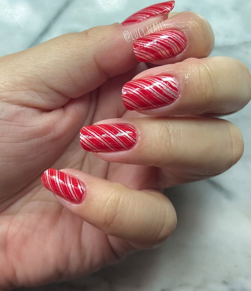 Peppermint nails are sweet and simple! Start with a white base coat, and once it’s dry, use red polish to create swirled lines that mimic a peppermint candy.