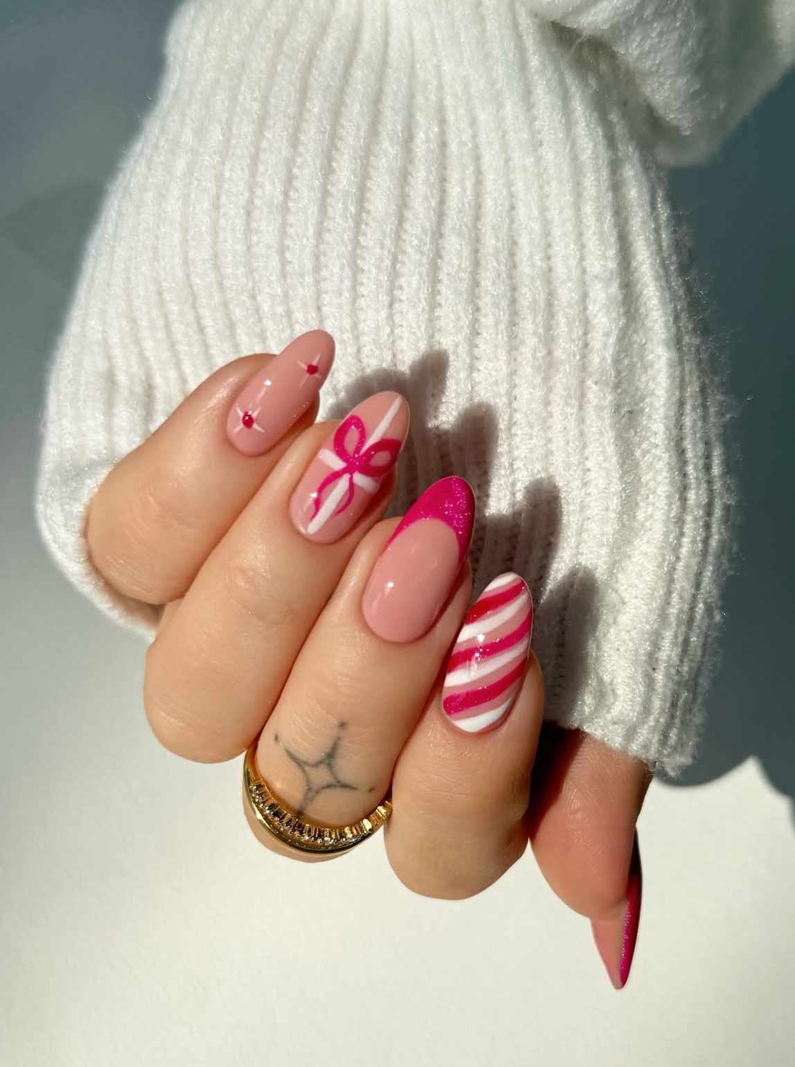 Start with a base color like red, green, or nude, and use a nail art brush to paint thin, crossing lines like ribbons on a gift. Finish by adding a little bow at the center. You can go for a mix of shiny or matte polishes to create texture.
